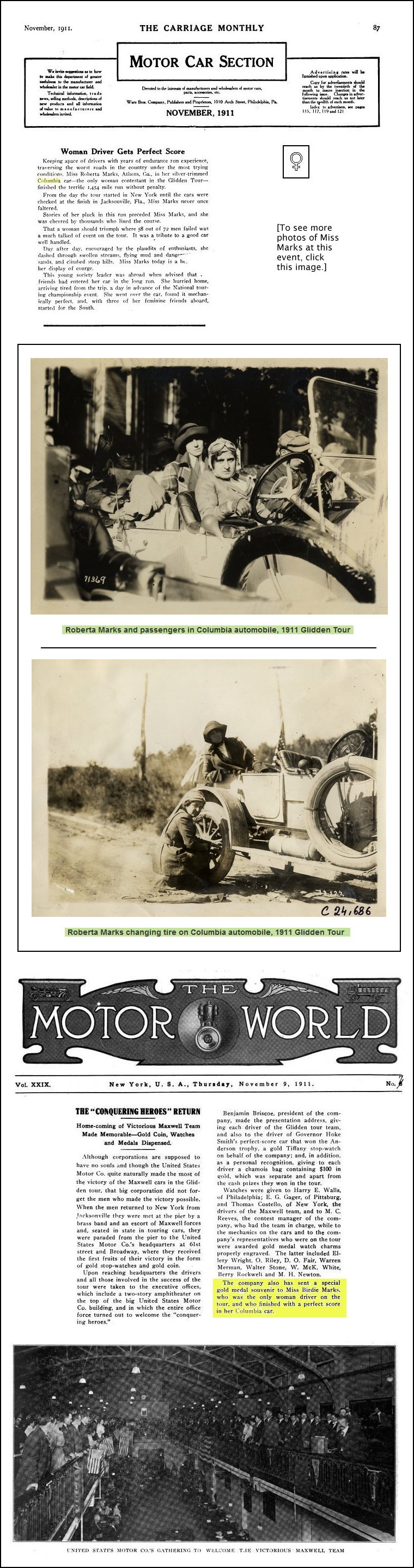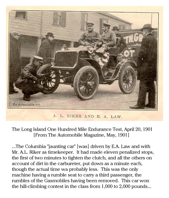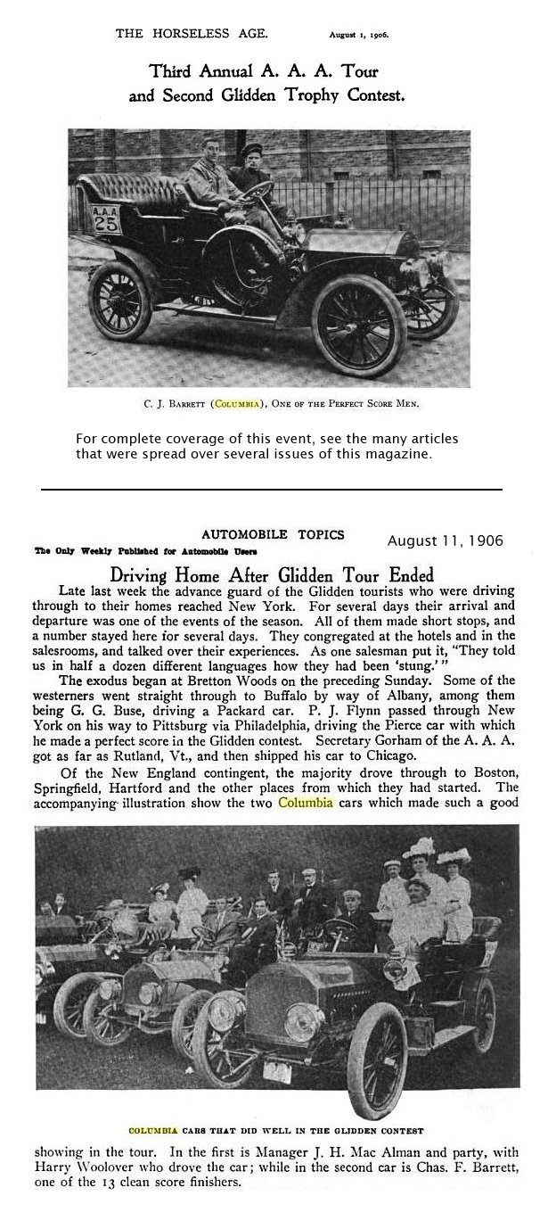 Eddie "Cannon" Bald is back to his first love, behind the wheel of a Columbia motor car again. The Columbia was Eddie's first motor love, just as the Columbia bicycle was Eddie's mount in the days when he was the international cycling champion. When Bald first became associated with motoring he sat in racers built for him in the Columbia factory at Hartford, Conn., following an apprenticeship in the Columbia factory. Bald's track generalship won him many events, and he also drove in one of the record breaking Columbia dashes from Chicago to New York. [Note: This was the re-taking of the record in October, 1904. Photos of Bald with Lawrence Duffie appear on an earlier webpage of this presnetation.] Bald is now associated with the agency for Columbia cars in Pittsburg, which city is now his home. |